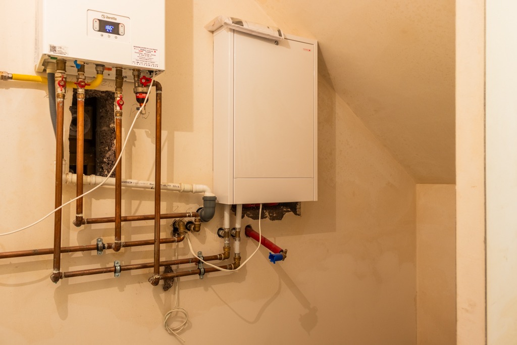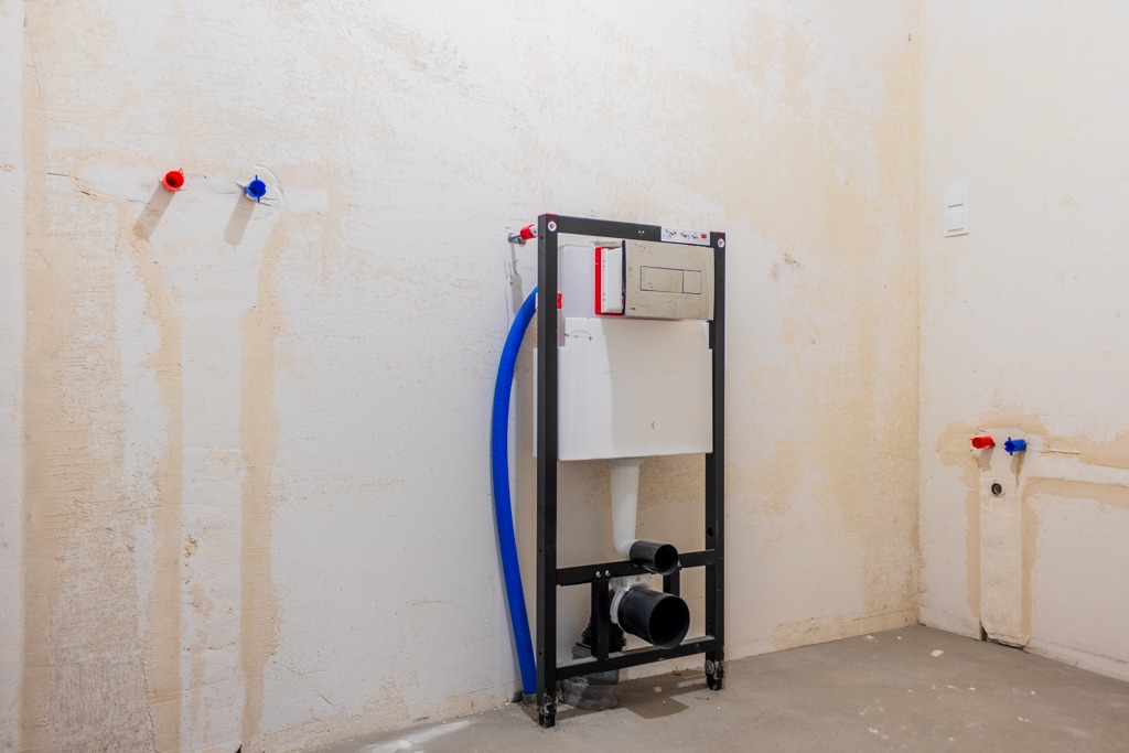 Wod-kan: Instalacja wodno-kanalizacyjna gotowa do użytkowania, z zamontowanymi stelażami podtynkowymi w łazienkach.