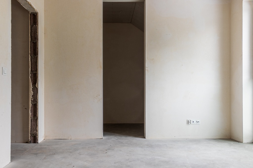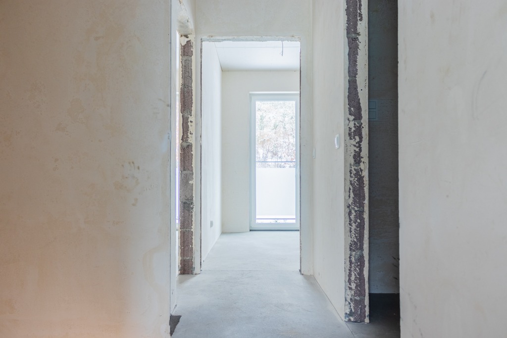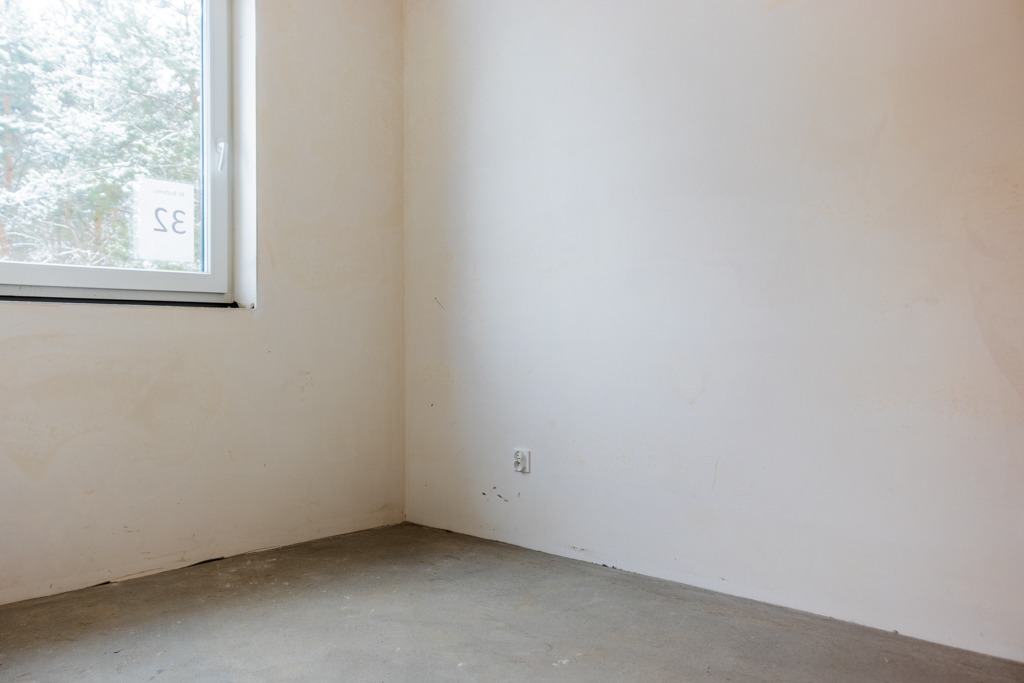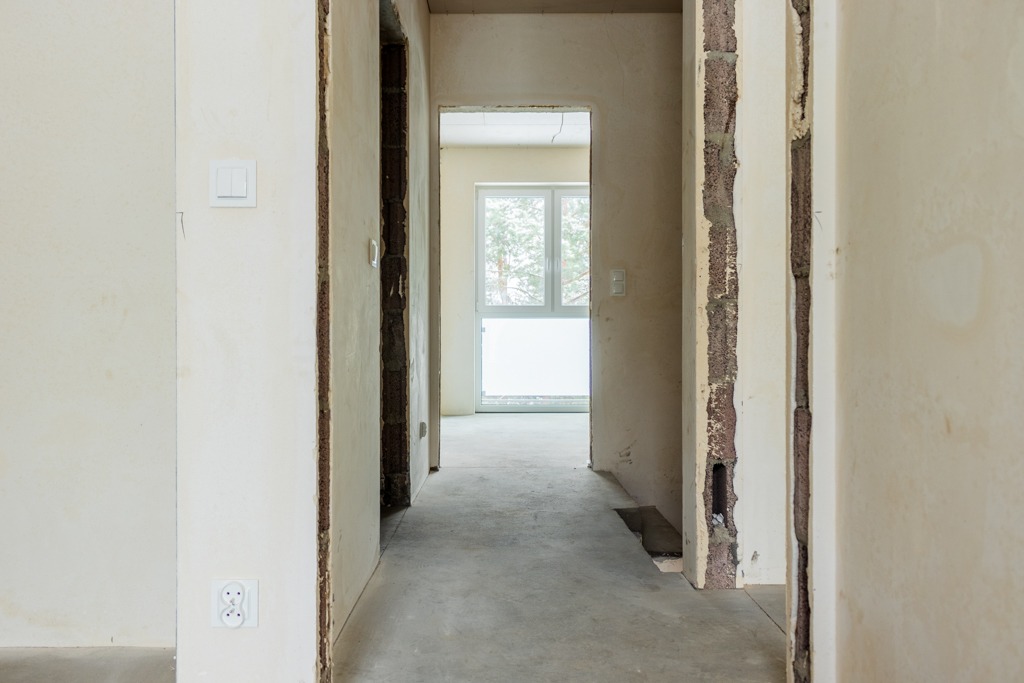 Tynki i posadzki: Ściany zacierane na ostro, gotowe do położenia płytek; posadzki w całym domu.