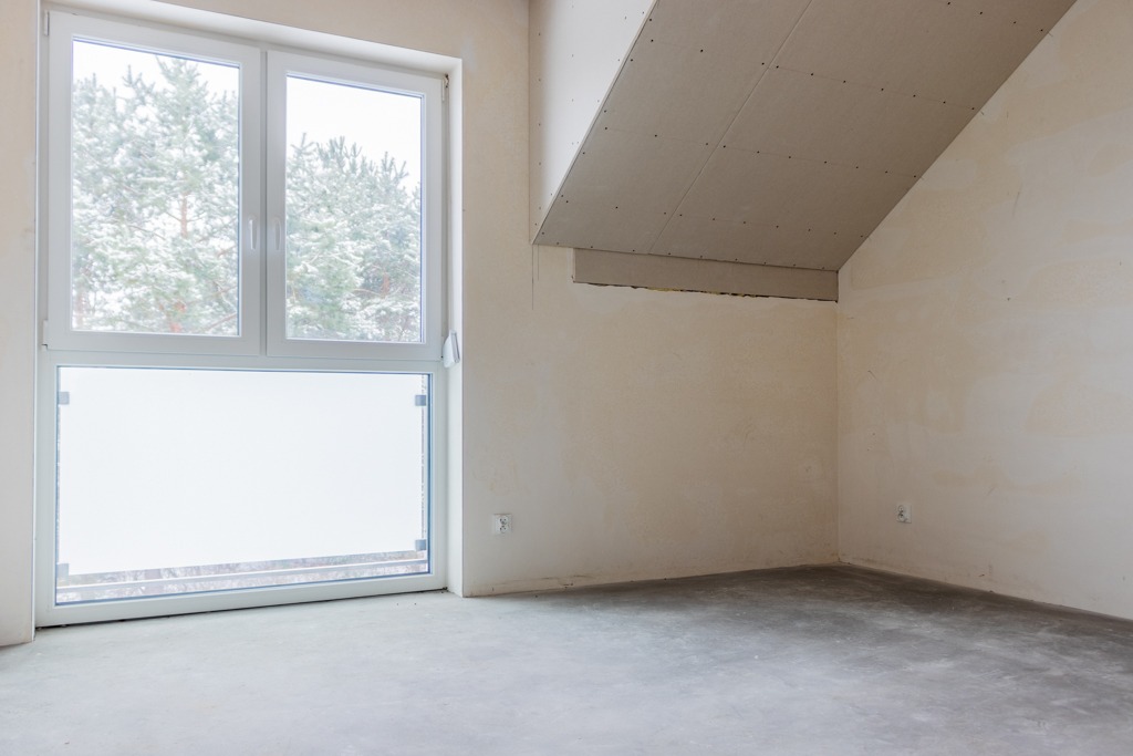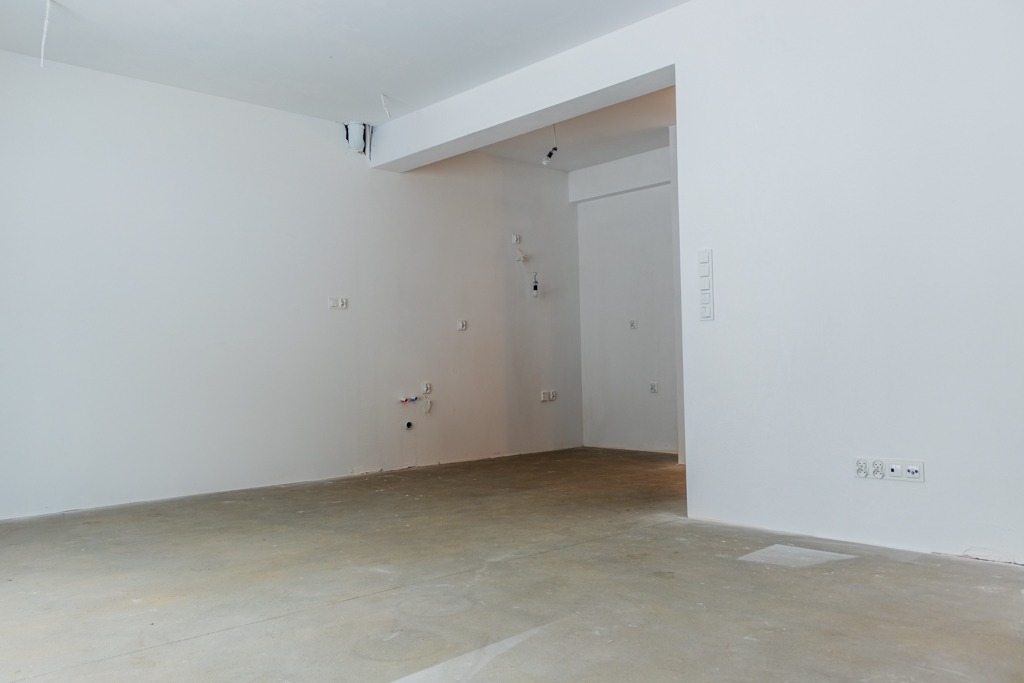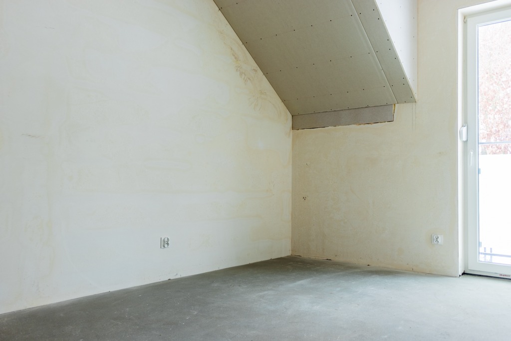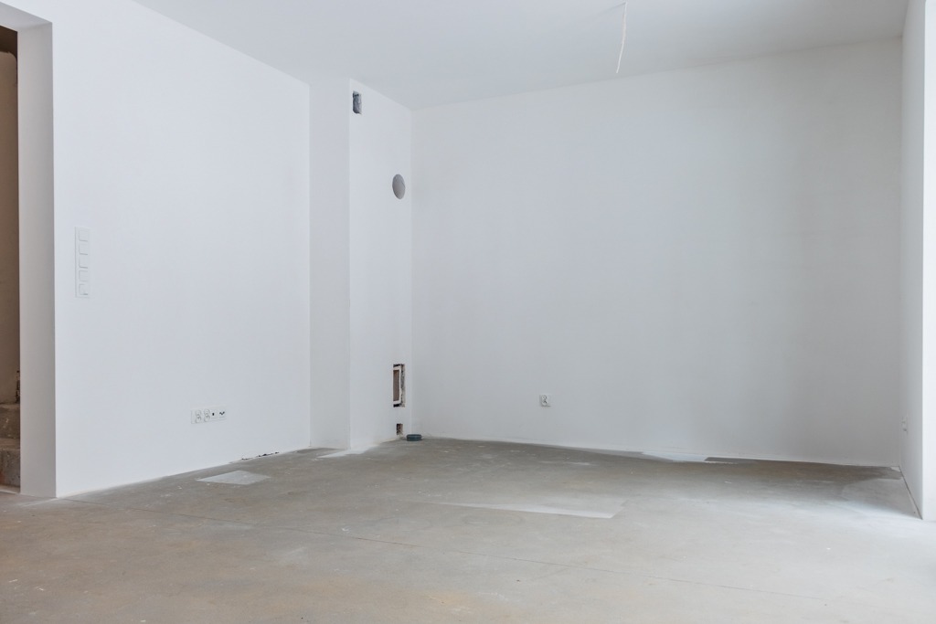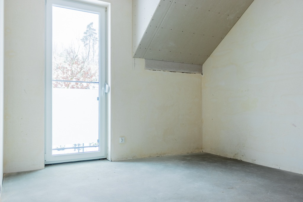 Tynki i posadzki: Ściany zacierane na ostro, gotowe do położenia płytek; posadzki w całym domu.