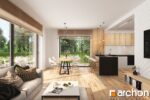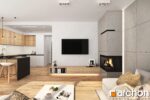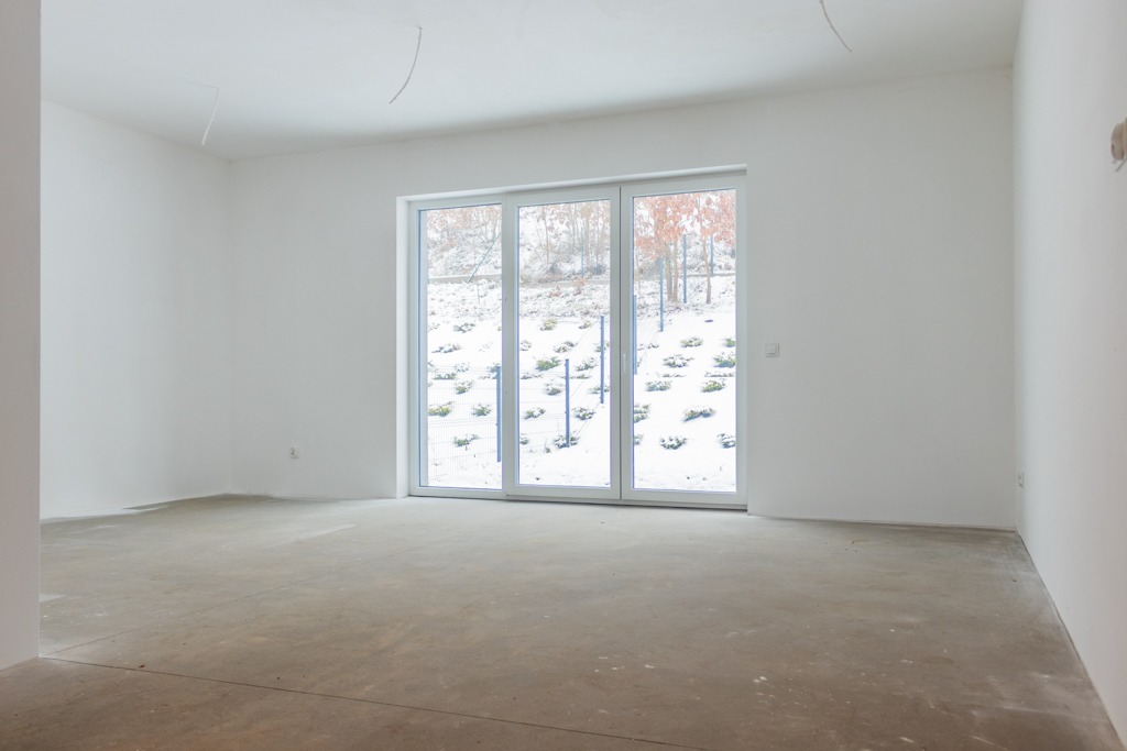Przestronny salon z aneksem kuchennym i jadalnią (34,3 m²) z wyjściem na taras oraz częściowo zagospodarowany ogród z widokiem na las.