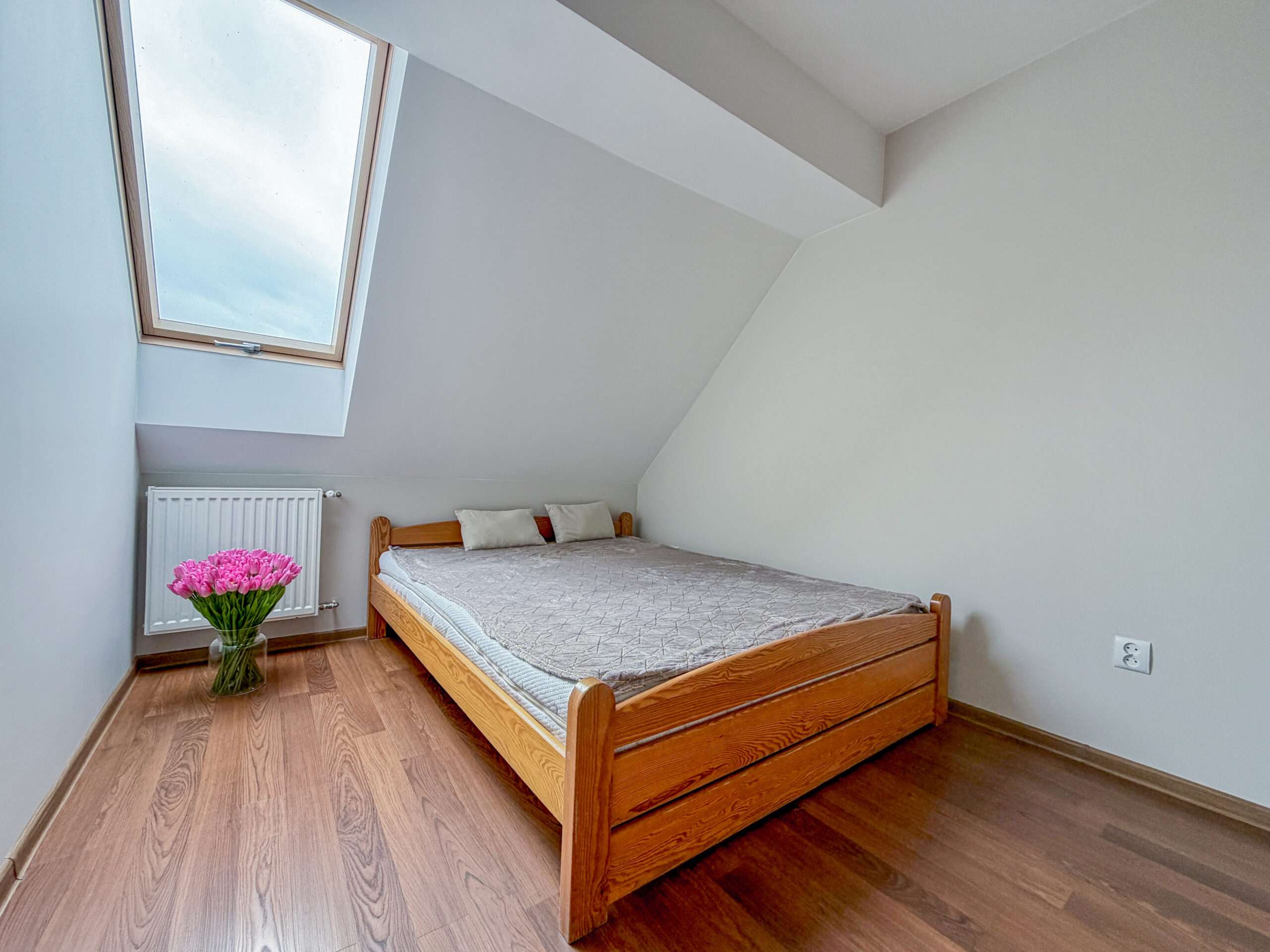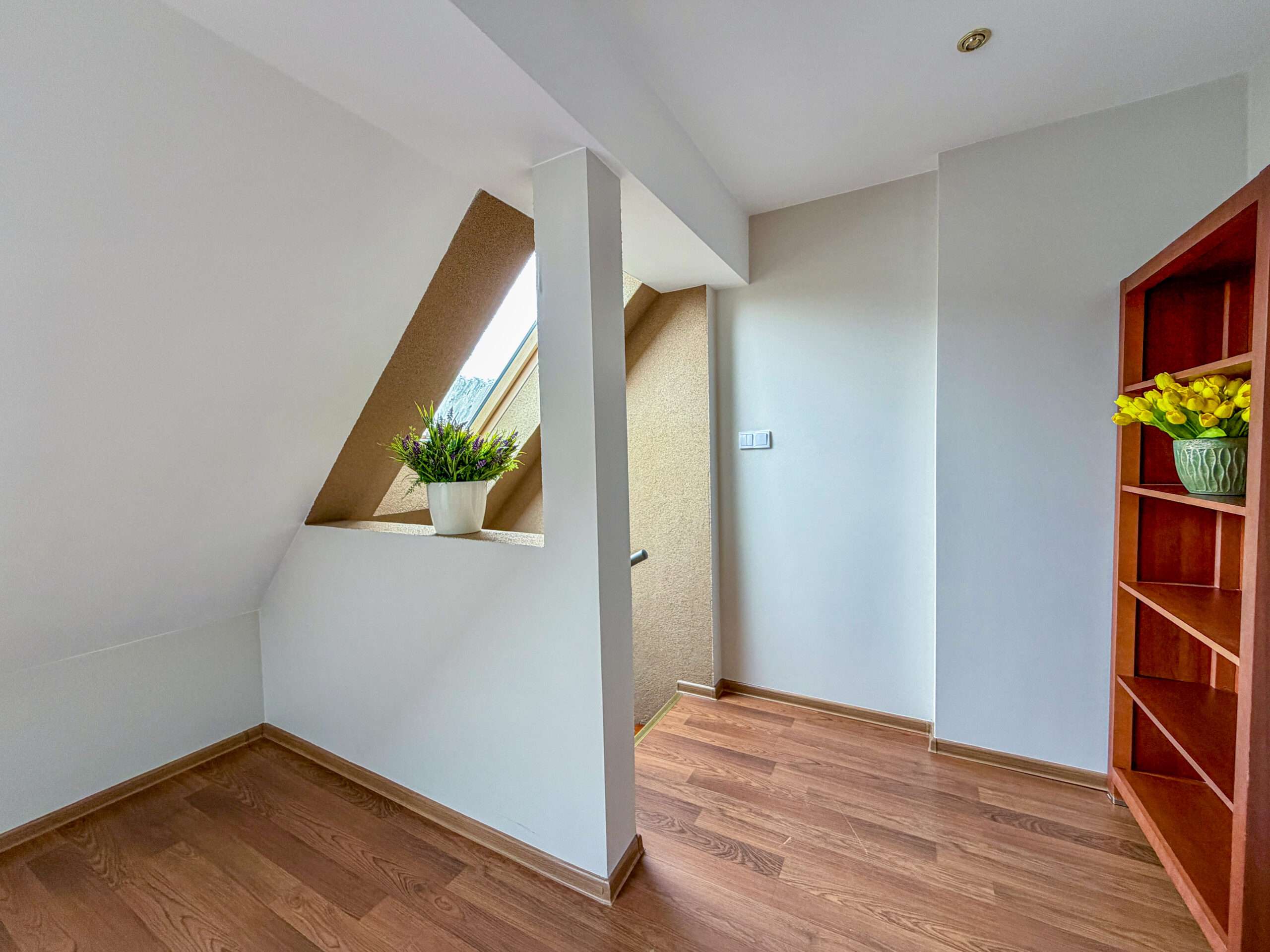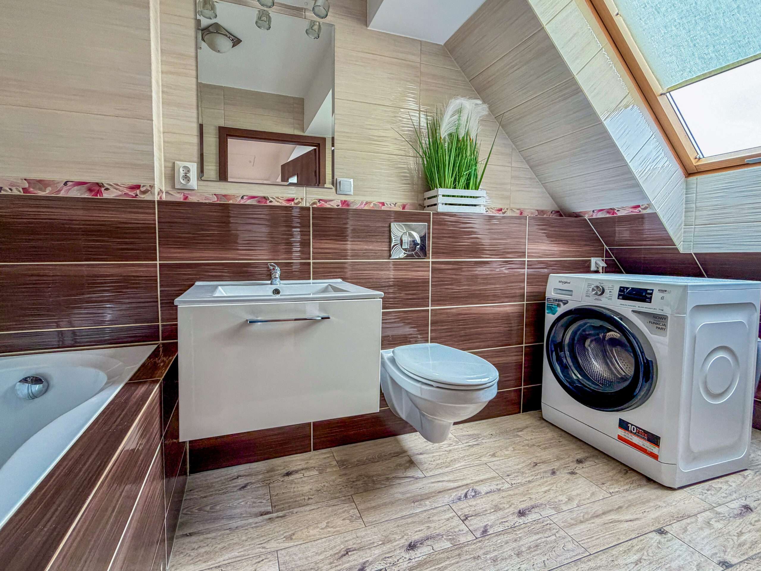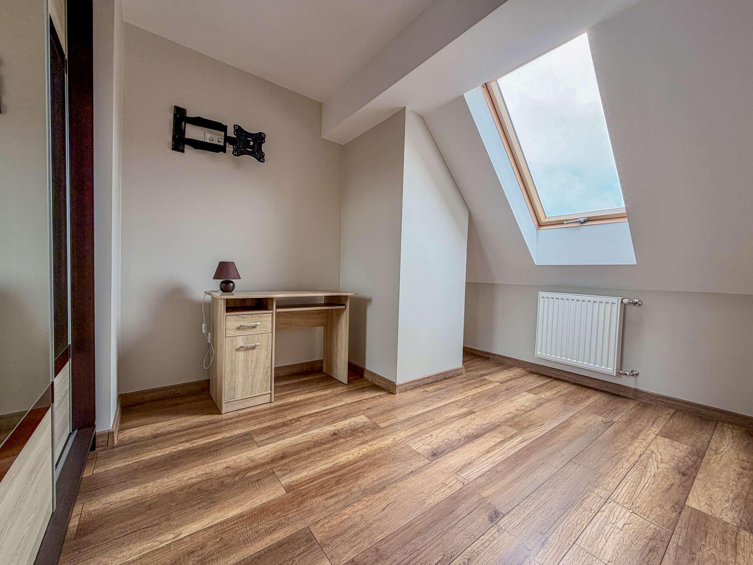 Dwupoziomowy układ zapewnia wyraźny podział na część dzienną i prywatną, co znacząco podnosi komfort codziennego użytkowania.