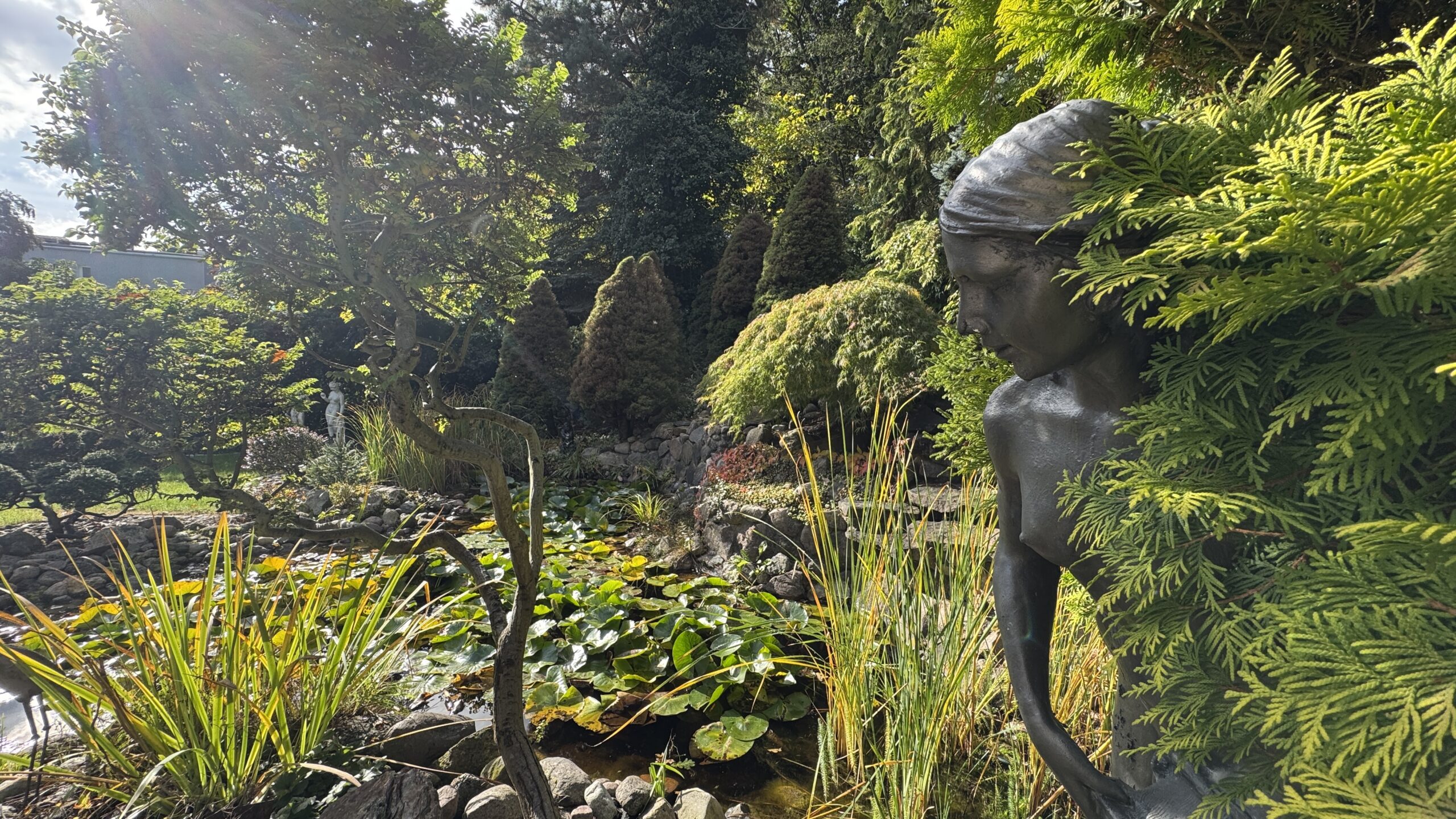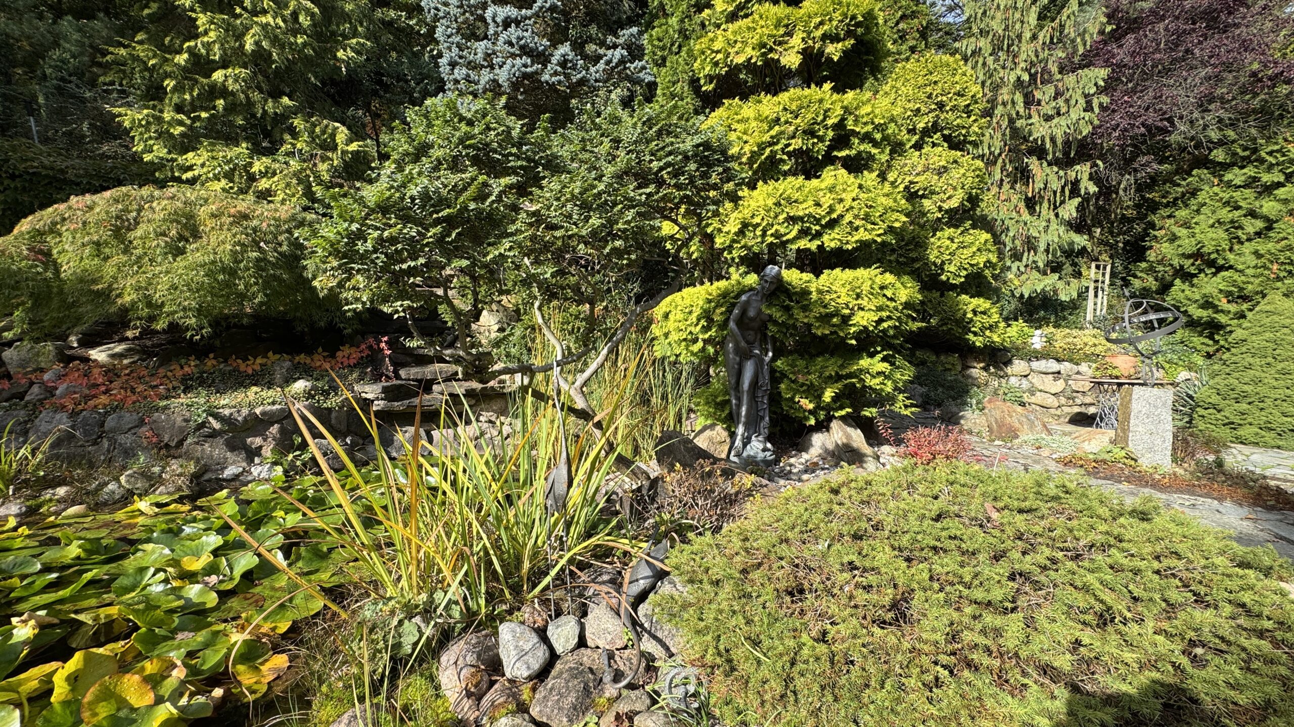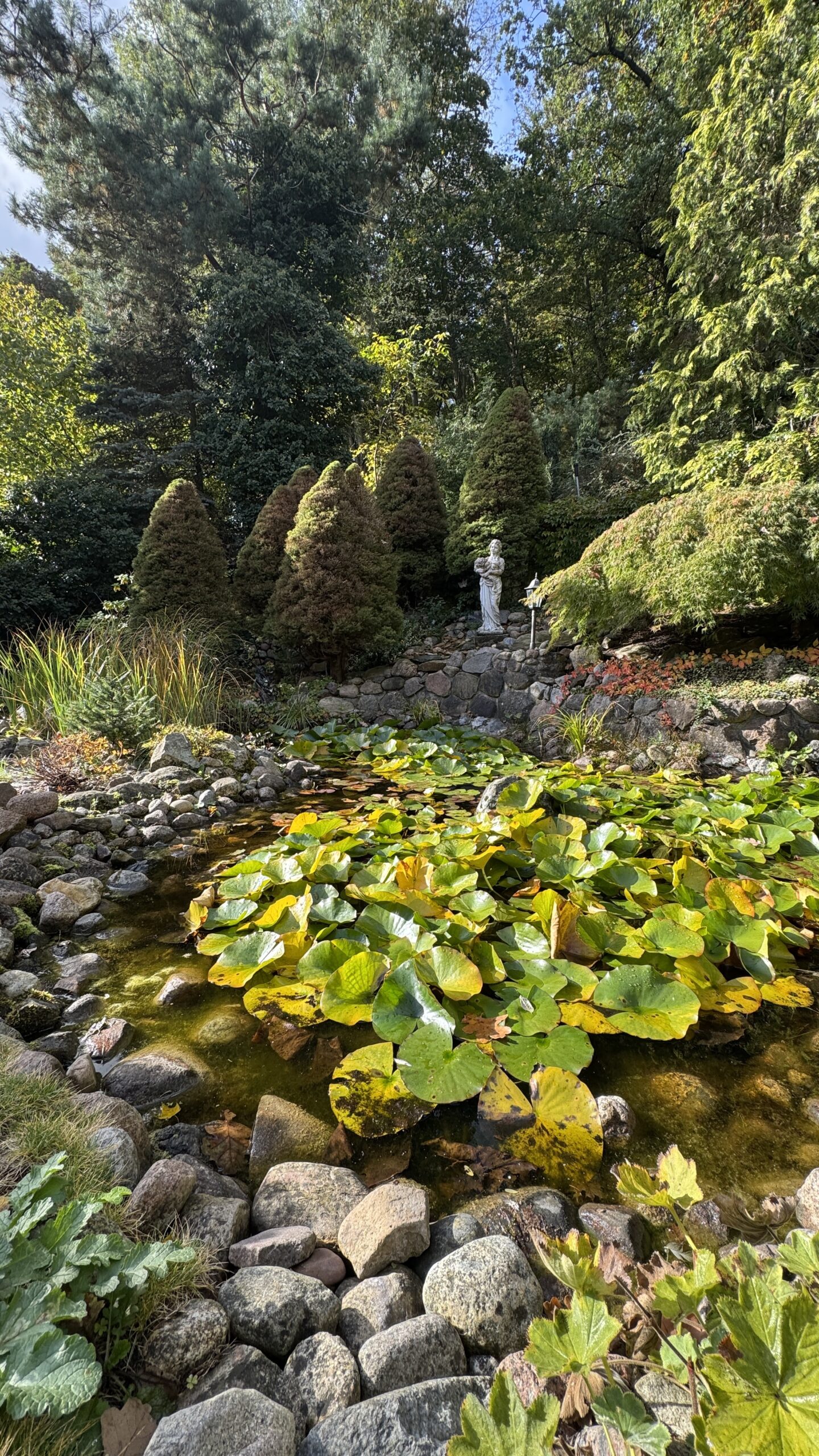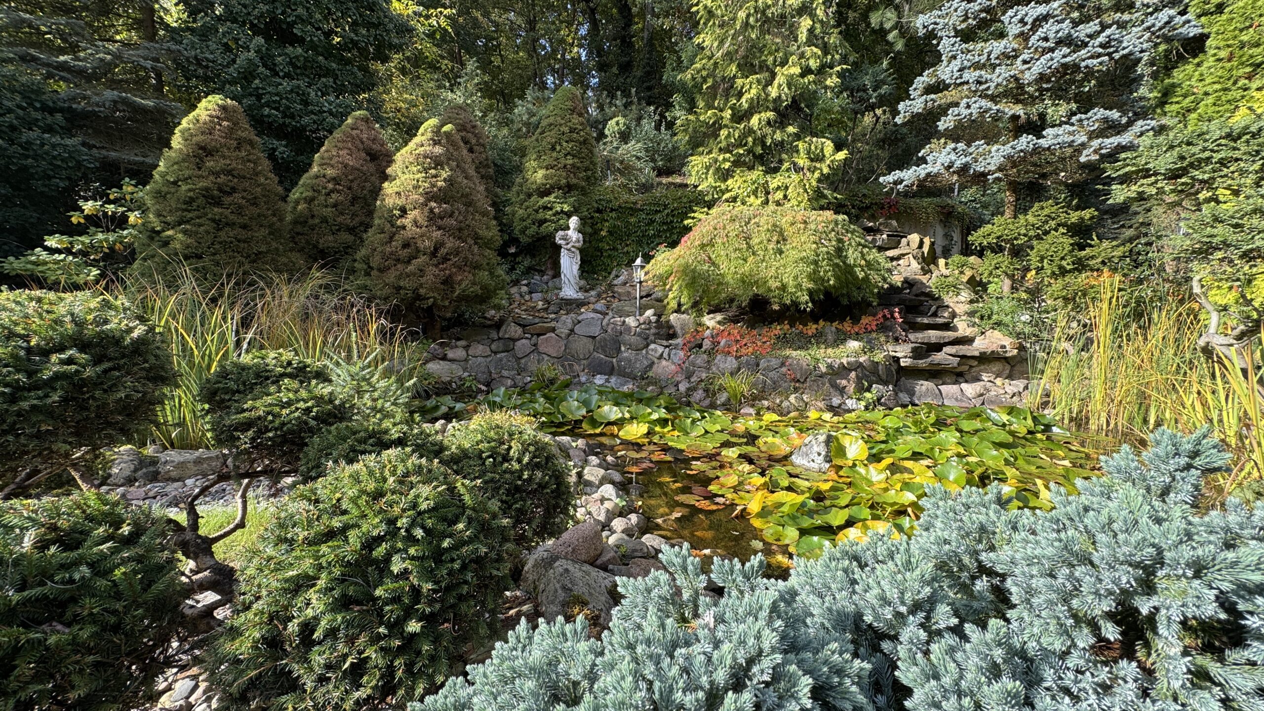 Ogród pięknie zagospodarowany – liczne nasadzenia, oczko wodne i niewielki prywatny staw,