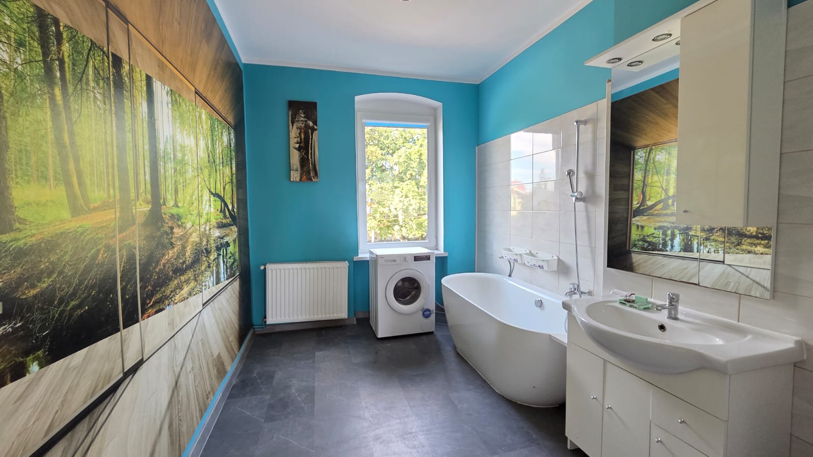 W łazience znajduje się duża wolnostojąca wanna z dużym oknem co powoduję , że łazienka jest jasna .