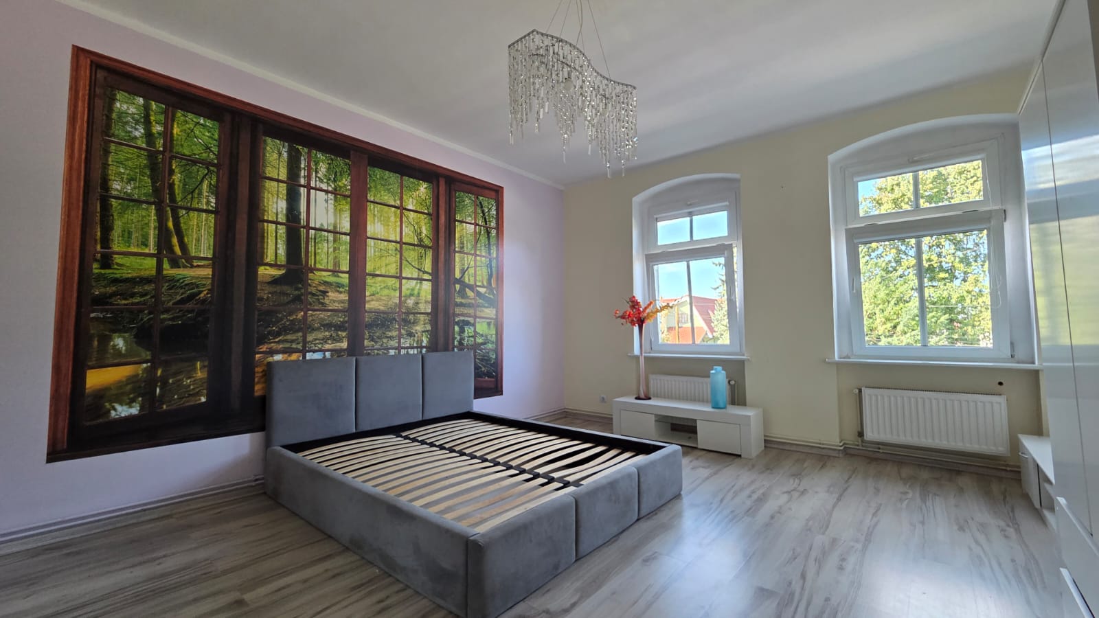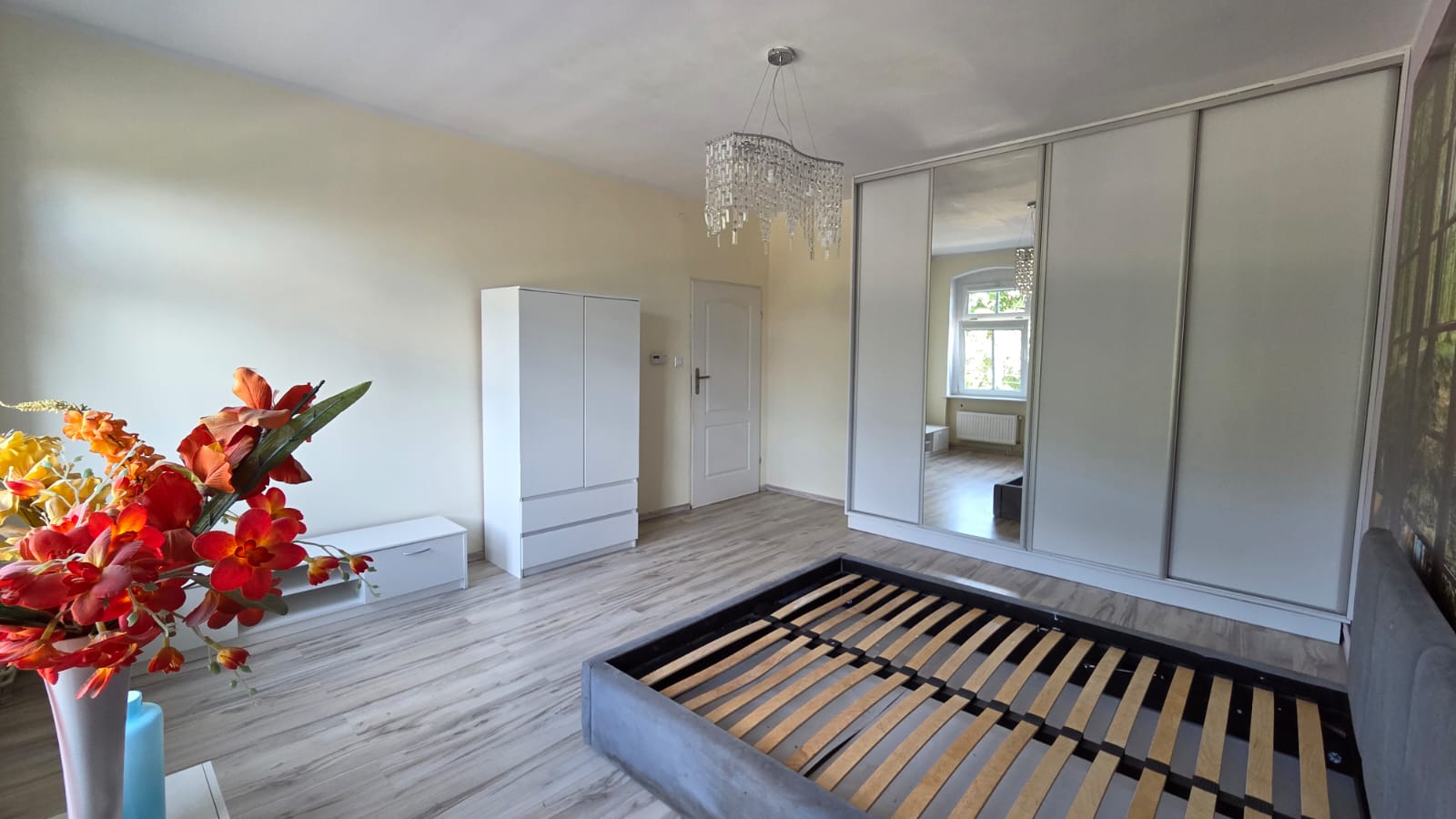 W sypialni znajduje się duże funkcjonalne łóżko do którego trzeba zakupić materac we własnym zakresie.