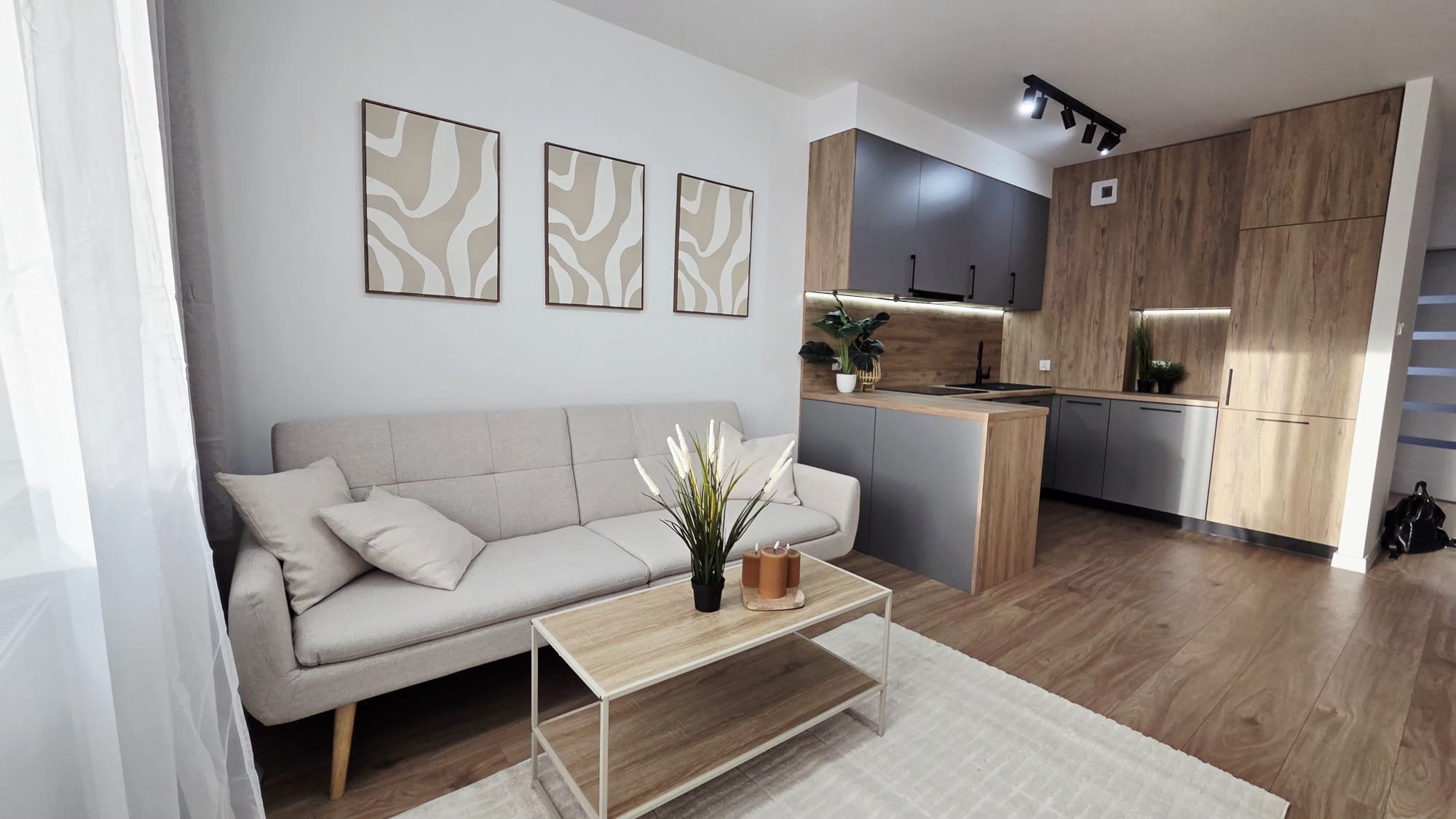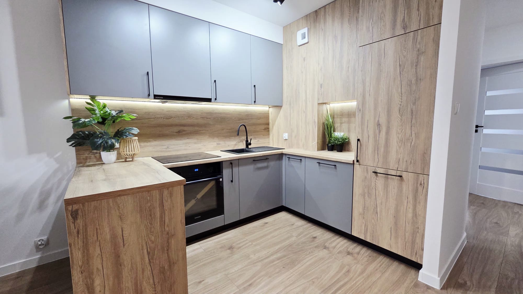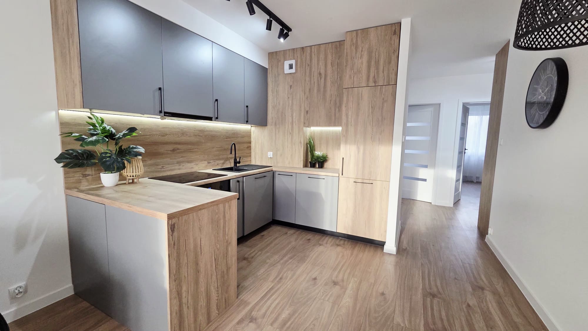 Wnętrze wykończone w nowoczesnym stylu. Kuchnia wyposażona w eleganckie meble wykonane na wymiar oraz nowy sprzęt AGD na gwarancji: