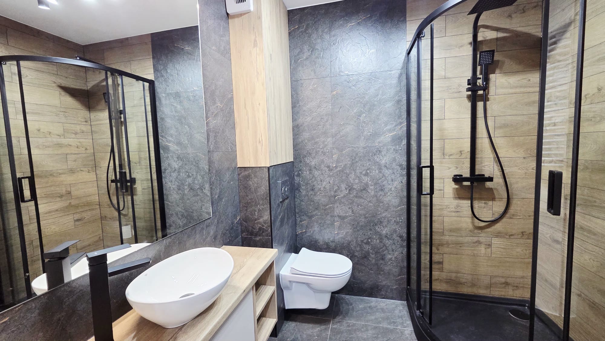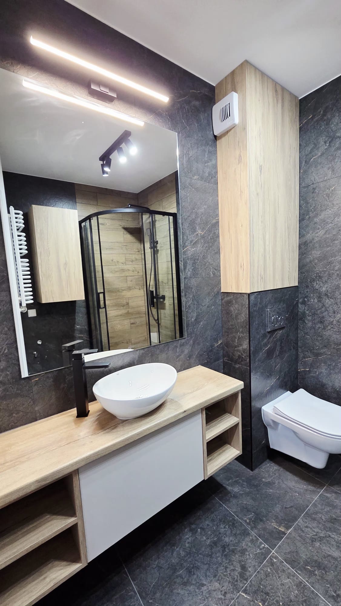 Łazienka przestronna, nowoczesna, wyposażona w meble wykonane na zamówienie, co gwarantuje estetykę i maksymalne wykorzystanie przestrzeni.