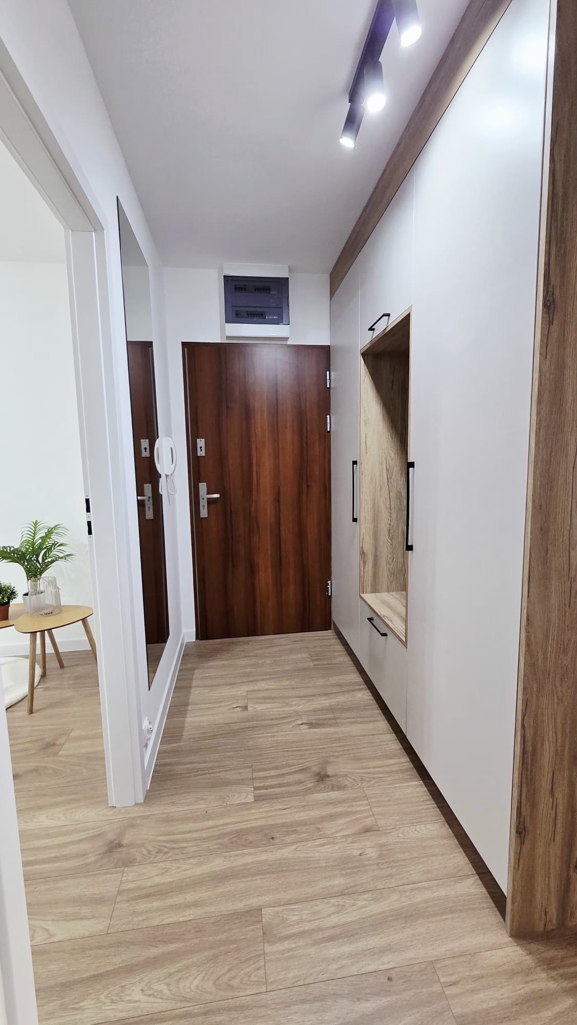 Przedpokój z dużą, pojemną szafą w zabudowie, zapewniającą wygodne miejsce do przechowywania.