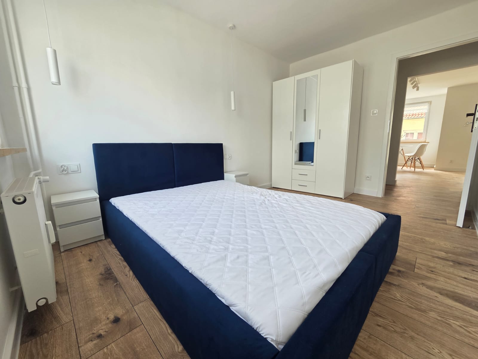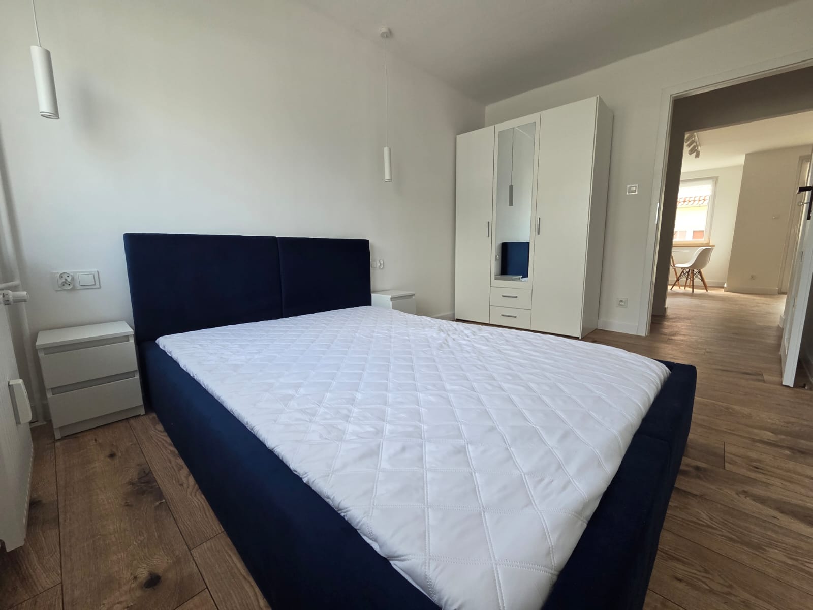 A w sypialni duże małżeńskie łóżko oraz szafki nocne i duża pojemna szafa.